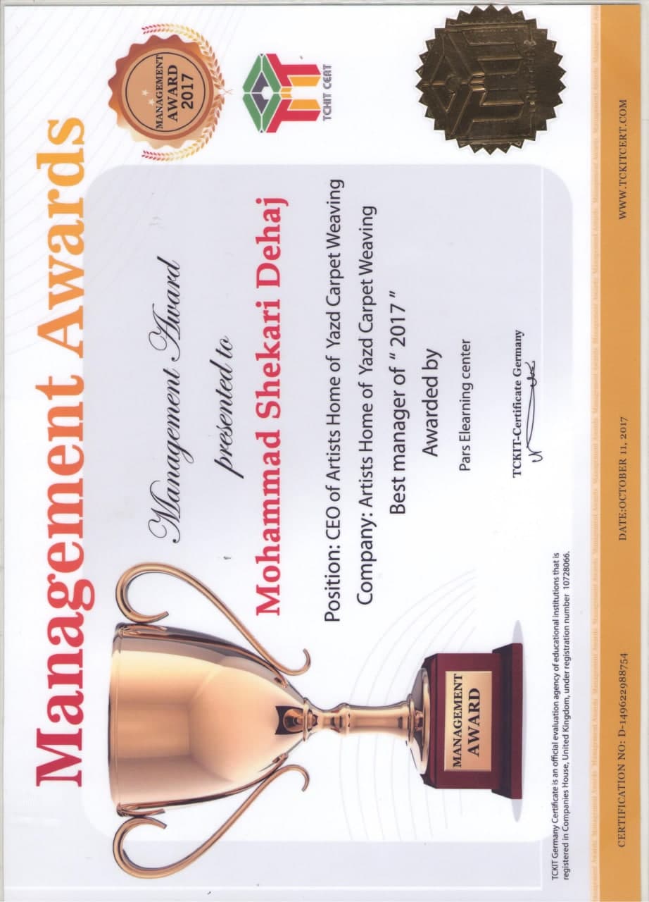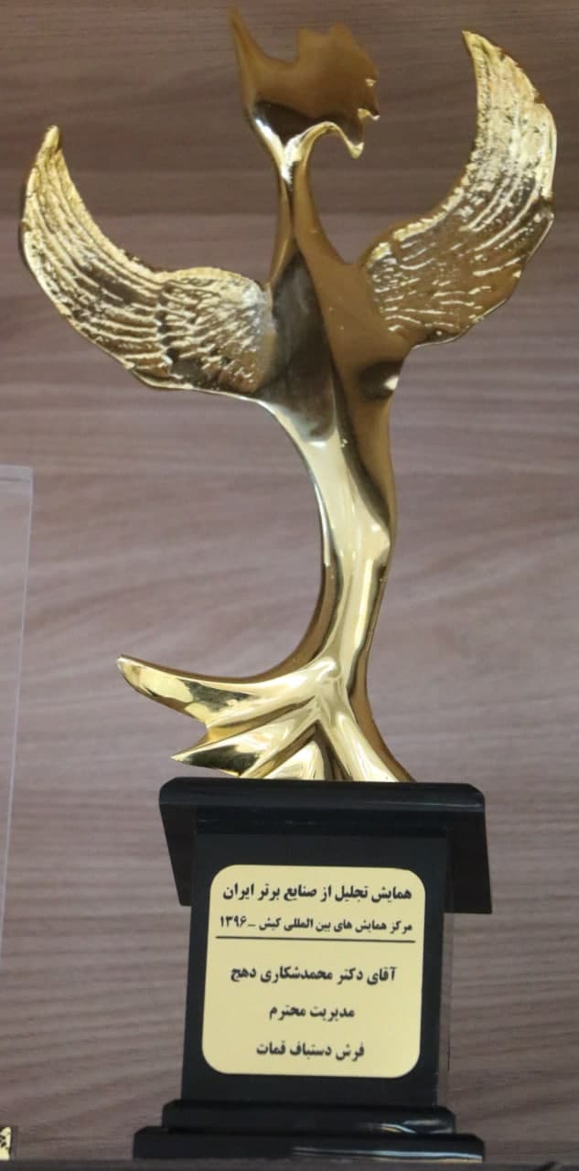 محمد شکاری به خاطر تولید طرح و نقشه جدیدی از قالی دستباف با کیفیت بالا و ضمانت ۳۰ ساله با عنوان قالی قمات، نشان نخل طلایی نام و نشان را از آن خود کرد.